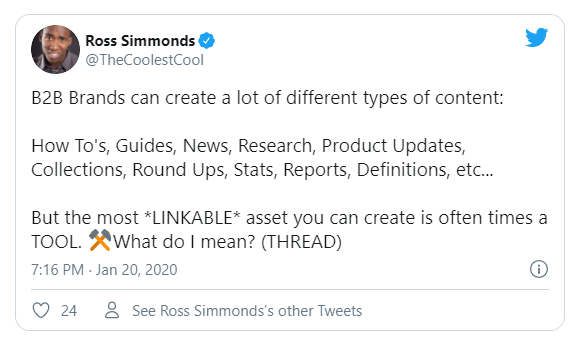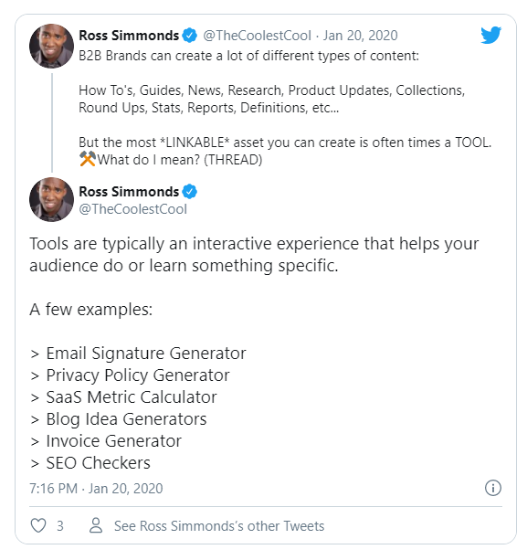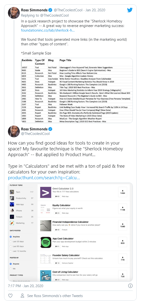 Все остаются в выигрыше. | | | | 2. Разработка и запуск бесплатного инструмента или калькулятора | | | Можно вывести свою стратегию лидогенерации на следующий уровень и разработать интерактивный инструмент или калькулятор, которым могли бы воспользоваться ваши идеальные клиенты. Подход весьма напоминает первую тактику: найдите проблему, с которой сталкивается ваша аудитория, и предложите бесплатное решение.Гендиректор Foundation Росс Симмондс (или @TheCoolestCool) недавно писал в Твиттере об этой концепции. | | | | Он рассуждает о таких инструментах с точки зрения линкбилдинга (как правило, если инструмент полезный, его часто упоминают, на него дают ссылку), но то же самое справедливо и для лидогенерации. Полезные инструменты — это те, которыми ваша аудитория будет пользоваться чаще всего. | | | | Росс также поделился несколькими тактиками поиска идей, которые подойдут вашему бизнесу: | | | По большому счёту, можно зайти на сайт вроде Product Hunt, где конструкторы и разработчики делятся инструментами, которые создают, и попробовать забить в поиск «калькуляторы» или «генераторы», чтобы узнать, какие продукты пользуются наибольшей популярностью: | | | | Вы можете попросить посетителей сайта оставить вам свой электронный адрес, чтобы вы могли прислать на него результаты использования вашего бесплатного инструмента. Это особенно хорошо работает, если инструмент создаёт некий отчёт (анализ сайта, генератор «Условий и положений» и т. д.), поскольку так вы сможете обосновать необходимость предоставления контактной информации — она понадобится, чтобы отправить пользователю результат. | | | | Пример № 1: Анализатор заголовков CoSchedule | | | | На этом моменте появляется форма лидогенерации, в которой вас просят указать своё имя, электронный адрес и информацию о компании, чтобы вы могли создать бесплатный аккаунт и посмотреть результаты. | | | | И только ПОТОМ можно посмотреть результат.