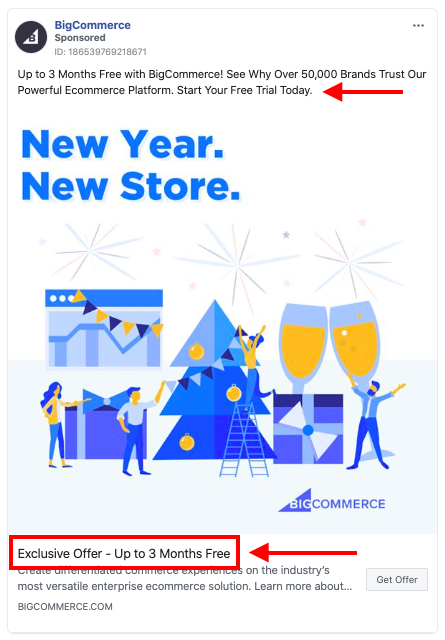 Вот небольшой анализ предложений, которые вы можете сделать разным группам целевой аудитории в рамках кампании по ретаргетингу, и задач каждой такой кампании: | | | | Можете сделать скриншот этой таблички и вернуться к ней, когда будете создавать свои собственные кампании по ретаргетингу. Теперь перейдём к примерам… | | | | Пример № 1: BigCommerce рекламирует эксклюзивное предложение | | | | BigCommerce — это платформа онлайн-торговли, которая таргетирует крупные бренды в области B2B. Весьма вероятно, что у этой компании высокие показатели пожизненной ценности клиента, поэтому, когда кто-то заходит на страницу для запроса демо-версии, BigCommerce делает всё возможное, чтобы конвертировать этого человека. Если посмотреть на их рекламу в Facebook, можно найти одно объявление, которое рекламирует специальную бесплатную пробную версию продукта, действительную в течение трёх месяцев: | | | | Скорее всего, это объявление видят только те, кто совершил определённое ценное действие на сайте BigCommerce (например, посещение страницы для запроса демо-версии), но не были конвертированы. Задача этой ретаргетированной рекламы проста: предложить бесплатный пробный период, после которого пользователи попадут в воронку продаж BigCommerce.