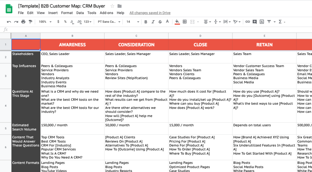«Поскольку органический трафик в блоге является нашим основным источником конвертируемого трафика, нужно увеличить органический трафик в блоге с 2000 сеансов до 3000 сеансов в месяц в течение следующих трёх месяцев.» | | | | 4. Разработайте карту путешествия корпоративного клиента | | | Мы, компания Foundation, всегда начинаем работу над стратегией контент-маркетинга с составления карты путешествия корпоративного клиента. Карта путешествия клиента — это возможность познакомиться с разными точками взаимодействия с клиентами в рамках вашей маркетинговой B2B-стратегии по мере того, как они перемещаются по воронке продаж, а также узнать, что влияет на их решения и какими вопросами они могут задаваться. Также на этом этапе можно понять, какой контент ответит на вопросы клиентов, сколько раз его будут искать в поисковиках, и какой формат лучше всего для него подойдёт. | | | | Чтобы составить карту путешествия клиента, начните со следующего: | | | - Определите основных стейкхолдеров (и тех, кого нужно привлечь) для каждого этапа покупательского цикла