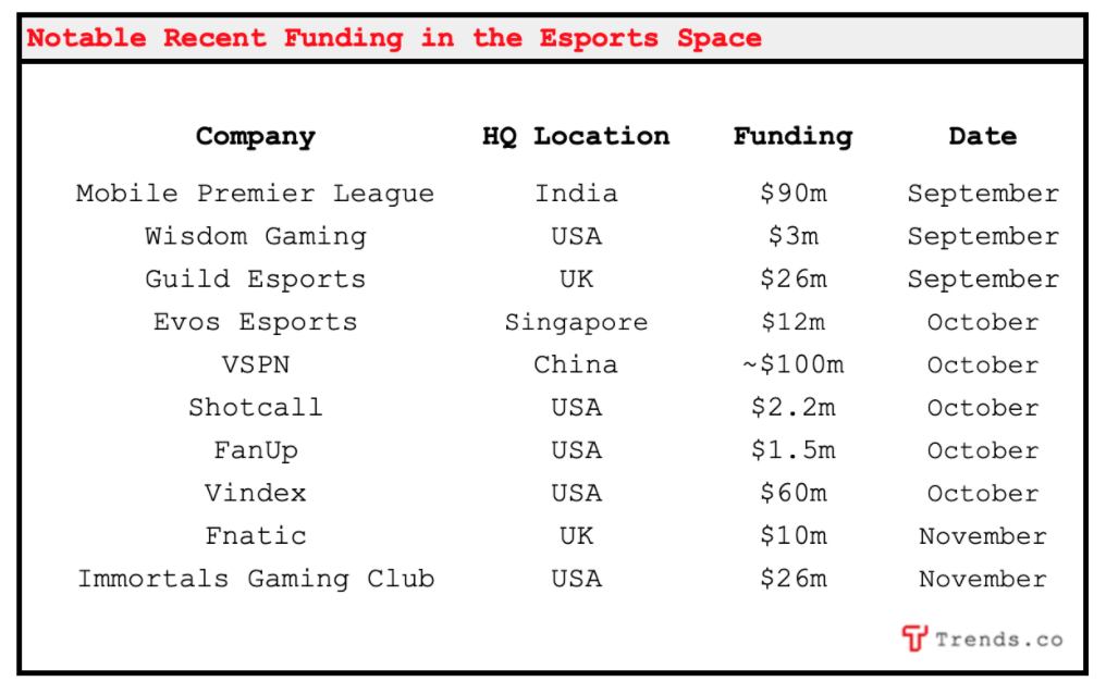 | | | Рынок киберспорта процветает. Трансляция финала самой популярной игры League of Legends в 2018 году привлекла больше зрителей, чем Суперкубок. В прошлом году мероприятие проходило в Париже, а билеты были распроданы за считанные секунды. С призовым фондом более $ 34 млн. звезды киберспорта могут уйти от турниров с большим количеством денег, чем чемпионы Уимблдона в одиночном разряде. Киберспорт уже имеет большую аудиторию, чем американский футбол и регби вместе взятые, и к 2022 году должен принести больше доходов, чем Лига чемпионов УЕФА и Формула-1. Прогнозируется, что отрасль, оцениваемая в $ 1,1 млрд. в 2019 году, достигнет 24,4% CAGR в 2020−27 годах. Наиболее просматриваемые виды киберспорта — это не традиционные спортивные видеоигры, такие как Madden и FIFA; это многопользовательские боевые онлайн-арены (MOBA), стратегии в реальном времени (RTS) и шутеры от первого лица (FPS). Однако по мере развития отрасли граница между спортом и киберспортом становится все более размытой: традиционные спортивные франшизы начинают охватывать киберразвлечения, и даже ходят разговоры о том, что киберспорт будет включен в олимпийскую программу. Самой популярной платформой для просмотра является Twitch; но поклонники обычно используют несколько платформ, включая YouTube, Facebook и даже телевещание. Это затрудняет точный подсчет зрителей для событий, но одно предельно ясно: зрительская аудитория стремительно растет. | | | Фанаты киберспорта, как правило, глубоко вовлечены и тратят в среднем 100 минут на сеанс. И рынок обслуживает не только «хардкорных геймеров»: только около половины зрителей на самом деле играют в видеоигру, которую они смотрят. Игры и киберспорт глубоко интегрированы: многие фанаты увлекаются киберспортом, профессиональной игровой сценой, благодаря собственному игровому опыту. Звезды и фанаты могут играть как в конкурентной борьбе, так и в непринужденной обстановке. В этой статье мы коснемся возможностей, которые сосредоточены на киберспорте, но интегрированы с более широким игровым пространством. | | | Финансирование во всем мире растет, поскольку инвесторы пытаются урвать кусок растущего пирога. Отрасль отличается огромным разнообразием инвесторов — от спортсменов и спортивных магнатов до IT бизнесменов и поп-музыкантов. В 2018 году (год, когда в киберспорт пришло 2,5 млрд. долл.) 100 Thieves завершили раунд Серии А, в ходе которого были привлечены средства от таких компаний, как Drake, Scooter Braun, Sequoia Capital и Marc Benioff. В прошлом году Уилл Смит вошел в тусовку с долей в Gen. G. В октябре этого года Guild, поддерживаемая Дэвидом Бекхэмом, стала первой киберспортивной фирмой, зарегистрированной на Лондонской фондовой бирже. | | | Отраслевые СМИ сообщают, что в августе и сентябре этого года было привлечено более 150 млн. долларов. Ежемесячное финансирование в октябре выросло до $ 300+ млн. Эти цифры не включают $ 1,78 млрд, привлеченные в августе разработчиком Epic Games (создателем Fortnite). А популярное мнение заключается в том, что мегатренд роста киберспорта все еще находится в ранней стадии. Мы поговорили с Джошем Чепменом, соучредителем фонда Konvoy Ventures, который занимается инвестициями в видеоигры на ранней стадии и специализируется на инфраструктурных технологиях (один из немногих в мире). «В сферу меня привлекла нехватка менеджеров специализированных инвестиционных фондов. Гейминг растет на 9% CAGR в