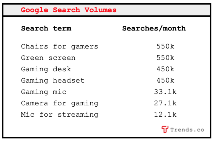 Он называет это «путь к профессионализму» — и предприниматели, которые разработают решения для растущего числа потенциальных звезд киберспорта, выиграют по-крупному. | | | 2. Здоровье и благополучие геймеров | | | Необходимость показывать класс на протяжении многих часов игры может потребовать огромных физических и душевных затрат — и звезды киберспорта выгорают. В июне этого года чемпион League of Legends (LoL) Цзянь «Узи» Зихао, считавшийся самой известной звездой киберспорта Китая, объявил о своей отставке в связи с «хроническими заболеваниями» — в возрасте 23 лет. Врачи, лечащие звезд киберспорта, сообщают, что видели смещенные сухожилия, боли в шее и спине, которые требуют хирургического вмешательства, а также высокий уровень беспокойства и бессонницы. В то время как здоровье спортсменов остается в значительной степени без внимания (в основном потому, что этот вид спорта не считается физически тяжелым), исследования начинают показывать, сколько медицинских сборов приходится платить. Линдси Мильоре, « Доктор Геймеров», стремится сделать здоровье и благополучие геймеров доминирующим направлением. Она одна из первых среди многих медицинских профессионалов и брендов, которая сосредоточилась на сфере, представляющей многочисленные возможности: Энергетические напитки: геймеры ориентируются на бренды, предлагающие продукты с чрезвычайно высоким содержанием кофеина, таурина и сахара. Энергетические напитки особенно популярны среди геймеров: объем поиска лидера рынка G fuel составляет 673k+/месяц. | | | Негативное воздействие этих веществ на физическое и психическое здоровье хорошо задокументировано. Существует острая потребность в более здоровых альтернативах. Предприниматели могли бы использовать растущую адаптогенную тенденцию и поставлять более здоровые энергетические напитки, включающие такие соединения, как L-теанин, специально для геймеров. Добавки: вы могли бы расширить ассортимент продуктов, ориентированных на геймеров, и создавать витамины, батончики, коктейли и т. д. Например, большинство спортсменов, занимающихся спортом в помещениях, испытывают недостаток витамина D; почему бы не разработать линию пищевых добавок специально для геймеров? С ростом внимания к здоровью и хорошему самочувствию, недалеко до того, чтобы представить себе рост поисковых объемов: - Gamer health: 4.4k