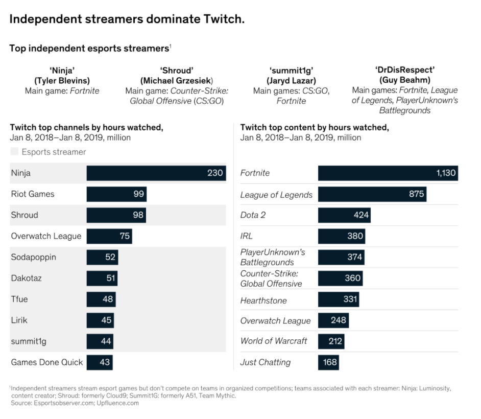 | | | 8. Независимые стримеры, казуальные игры и киберспорт | | | Самыми популярными событиями киберспорта являются крупные командные соревнования, такие как чемпионаты мира, которые привлекают рекордное количество зрителей. Но важно отметить, что профессиональные соревнования составляют всего 11% от общего количества просмотров. Согласно отчету McKinsey, все 10 лучших каналов Twitch за 2018 год были посвящены киберспорту, но 7 из них были персональными каналами стримеров. И только 2 из них были членами профессиональных команд: Независимые стримеры функционируют больше как артисты, чем спортсмены. В августе этого года, когда Shroud (ушедший в отставку из профессионального CS: GO в 2018 году) вернулся в Twitch после перерыва в стриминге, 300k+ зрителей наблюдали за его экраном ожидания еще до того, как он появился. Пик потока пришелся на 516k+ зрителей. During October, Twitch had an average of 2.15m viewers at any given moment. Compare this constant pull to the 5.6m viewers of the deciding game of the NBA Finals, one of the most popular sporting events in the US. The NBA finals also experienced record low ratings this year — while Twitch’s numbers continue to rise. | | | Альтернативные платформы: Twitch является доминирующей стриминговой киберспортивной платформой, которая в настоящее время может похвастаться 91.1% долей рынка в часах стриминга. YouTube Gaming и Facebook Gaming — альтернативные платформы. Microsoft попыталась соперничать с Twitch с платформой Mixer — даже привлекли стримеров-гигантов Ninja и Shroud — но зрители не последовали их примеру, и платформа потерпела крах в июле этого года. Падение Mixer иллюстрирует, что потоковое вещание в первую очередь социальное: внутрипотоковые чаты и устоявшееся чувство общности — это важнейшие части зрительского опыта. После Mixer будут платформы, которые будут прощупывать почву, чтобы соперничать с Twitch; те, кому это удастся выиграют по-крупному. | | | Новости киберспорта: ESPN только что объявила о прекращении освещения киберспорта. Хотя фирма связала это решение с увольнениями, связанными с COVID, ясно, что ежедневное редакционное покрытие киберспорта, которое ESPN начала в 2016 году, не находило своей успешной ниши на рынке. Скорее всего, это связано с участием фанатов на таких платформах, как Twitch, Discord и Reddit, а не с трансляцией телепередач или информационных бюллетеней. Например, R/GamerNews имеет почти 500 тыс. подписчиков и переживает экспоненциальный рост. Эти массивные, устоявшиеся сообщества держат своих членов в курсе происходящего в режиме реального времени; и оставляют мало места для сторонних провайдеров новостей. Предприниматели могут прокрасться в нишу, воспользовавшись имеющейся инфраструктурой сообщества. Например, транслируя новости киберспорта с участием топовых стримеров и разработчиков игр в Twitch. Чат в прямом эфире обеспечит постоянный поток вопросов и ответов и вовлечение сообщества. | | | Подборка новостей может быть размещена на аккаунте YouTube, для фанатов, которые не могут присоединиться вживую. Стримерское партнерство: Многие фанаты киберспорта поддерживают своих любимых стримеров с помощью ежемесячной подписки за 5 долларов ( 50% из которых идет на Twitch). Это дает зрителям доступ к эксклюзивному контенту, такому как чаты только для подписчиков, смайлики и бейджи. Это прибыльный рынок для стримеров (и платформ): DrLupo получил ~$ 42k в ноябре этого года от своих 16.96k активных подписчиков. Предприниматели начинают использовать желание фанатов платить за эксклюзивный контент и чув