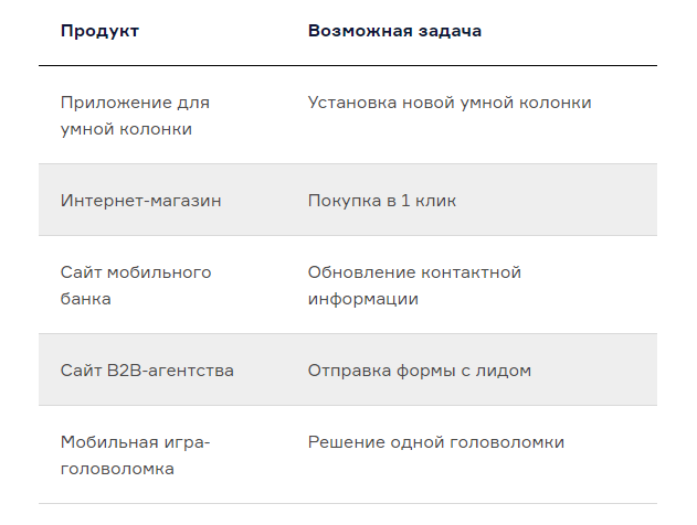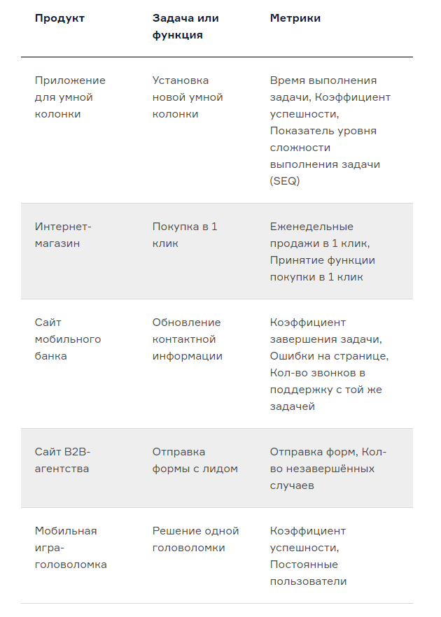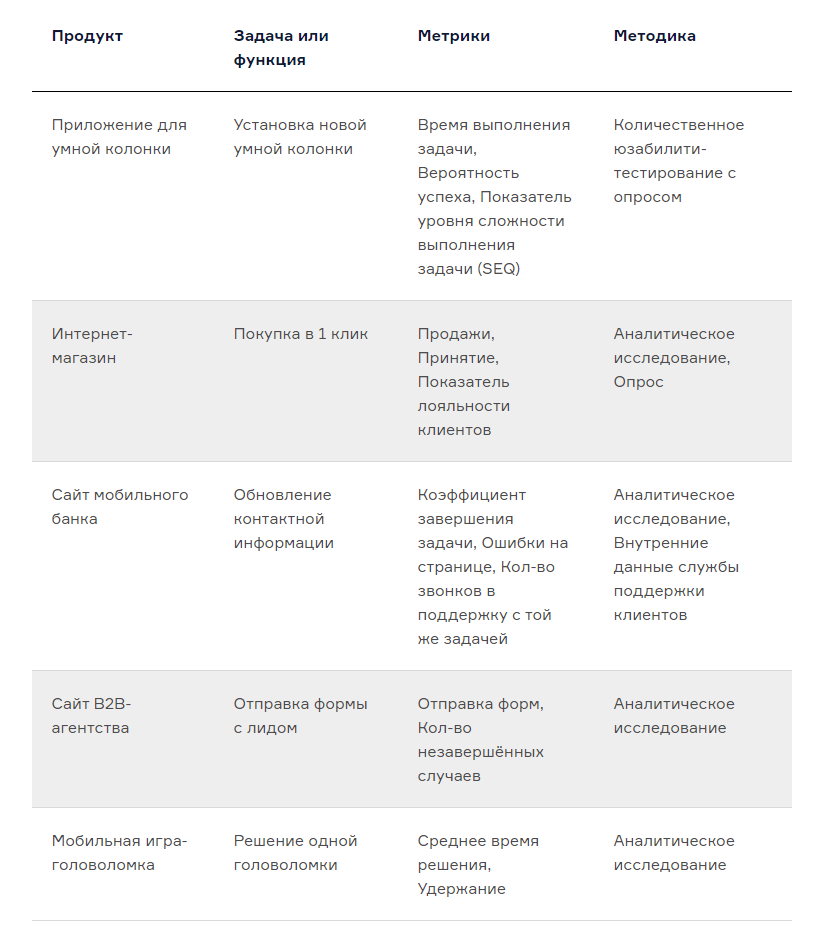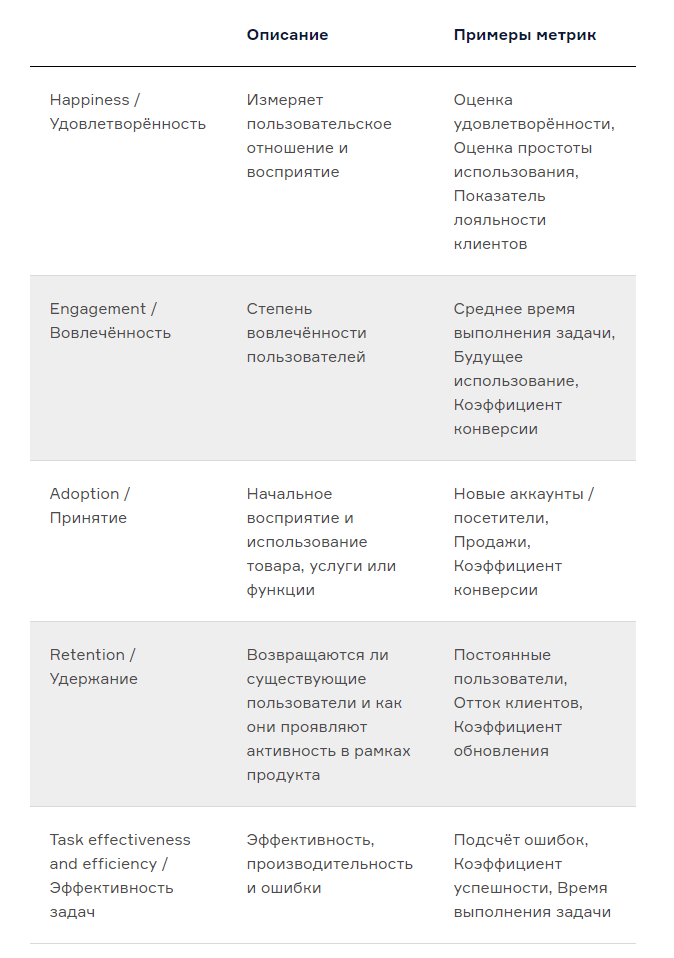 | | | Определите, какие основные задачи пользователи выполняют, пользуясь вашим продуктом. Если у вас ещё нет списка основных задач, можно сначала задокументировать большую часть задач продукта. Затем следует определить приоритетность задач и выбрать 5−10 из них, которые представляют наибольшую важность для ваших пользователей. В табличке ниже перечислено несколько возможных продуктов и сценариев задач. В то время как в табличке каждому продукту соответствует лишь одна задача, в реальной жизни, скорее всего, вы будете работать с несколькими. | | | | Итак, вы подготовили список задач. Как их измерить? Фреймворк HEART от Google предоставляет краткий обзор разных метрик, которые можно начать собирать и отслеживать. Таблица ниже — это адаптация фреймворка HEART: | | | Примите во внимание, что при измерении вовлечённости показатель времени выполнения задачи должен быть высоким (например, долгое время прочтения статьи на новостном сайте), а при измерении эффективности — низким (например, быстрое оформление заказа в интернет-магазине). Иными словами, одно и то же изменение (например, увеличение времени выполнения задачи) может быть как позитивным, так и негативным, в зависимости от того, какая функциональность оценивается. Отбирайте метрики, которые будут иметь значение в долгосрочной перспективе, так как, в идеале, вам придётся собирать систематически одни и те же метрические данные на протяжении нескольких лет. Постарайтесь найти 2−4 метрики, которые отвечают за разные аспекты вашего пользовательского интерфейса (например, удовлетворённость и вовлечённость). Вот несколько примеров метрик, которые можно отслеживать для задач, перечисленных в предыдущей таблице. | | | | Бенчмаркинг пользовательского интерфейса заключается не только в отслеживании метрик, но и в демонстрации ценности продукта. Сделать это намного проще, если выбрать метрики, которые соответствуют ключевым показателям эффективности (KPI) вашей компании. Например, если речь идёт о банке, одним из показателей эффективности работы которого являются расходы на поддержку пользователей, можно продемонстрировать, как переработанная форма для связи позволила сократить расходы на поддержку, отследив количество звонков в поддержку до и после переработки. | | | | Этап 2: Решите, как измерять | | | Чтобы определиться с методикой сбора метрических данных, важно учесть время, которое будет потрачено на проведение исследования определённым методом, стоимость его проведения, необходимые навыки исследователей и доступные вам инструменты исследования. Не стоит хвататься за метод, который требует отсутствующих у вас навыков, поскольку отсутствие результата – лучше, чем неверный результат. Также не стоит начинать работать согласно плану, который потребует чрезмерных финансовых вложений в долгосрочной перспективе (потому что суть бенчмаркинга заключается в повторном проведении замеров). Прежде чем начать планировать новое исследование, обратите внимание на данные, которые у вас уже есть и соответствуют измеряемому опыту взаимодействия. Весьма ценным может оказаться полноценное понимание пользовательского опыта и привязка UX-метрик к более крупным целям компании. Запрашивая данные из разных источников, важно объяснять, почему вам нужные эти данные и как вы собираетесь их использовать. Су