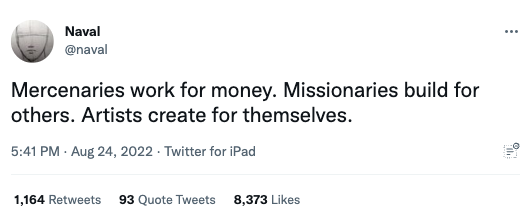 | | | «Наемные работники работают из-за денег. Миссионеры делают для других. Артисты создают для себя».