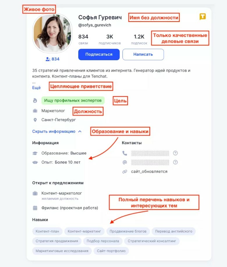 - Реальное фото и имя. Не используйте картинки или логотипы компаний — это огромный минус к конверсии в подписку. Скоро в TenChat для этого появятся специальные профили компаний.