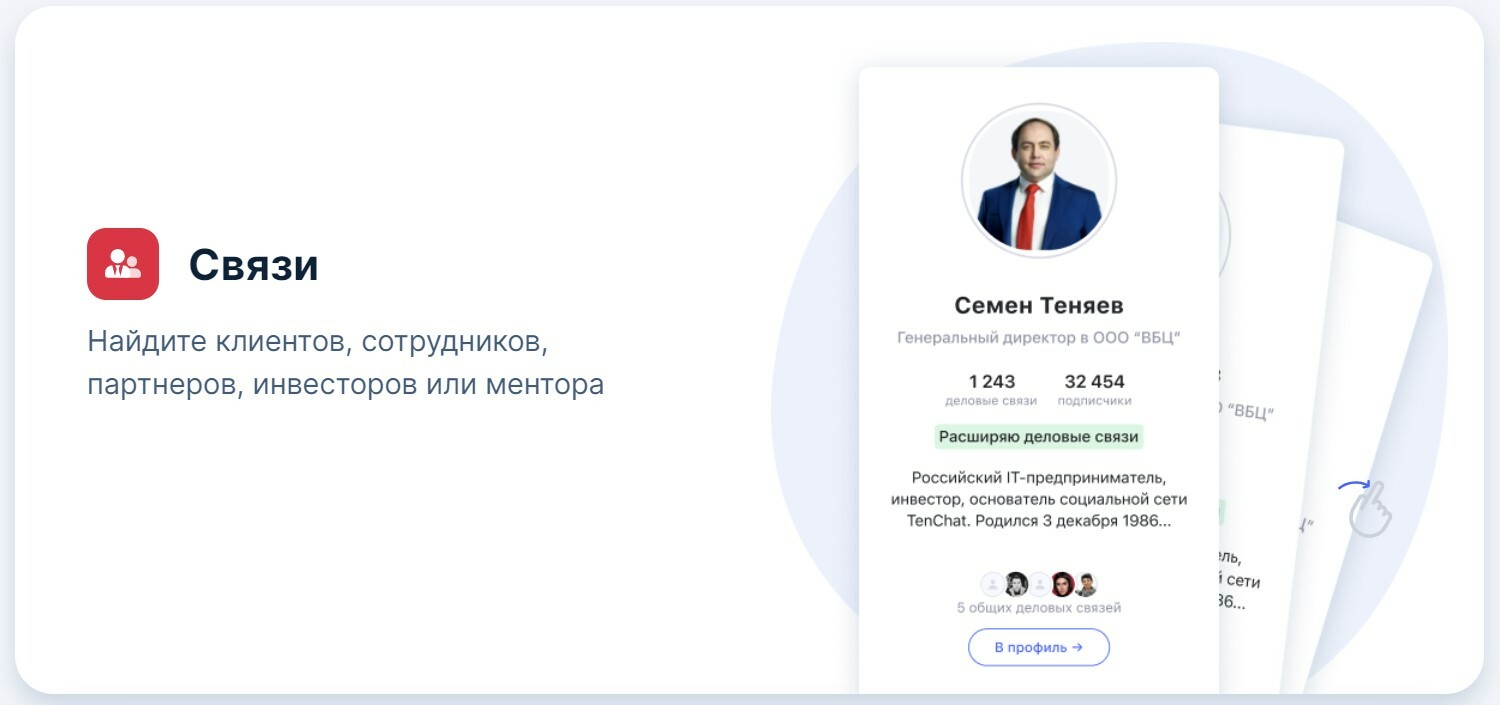 Есть и другие способы — активность и комментарии под постами блогеров, масслайкинг. Но заниматься таким нет смысла, по соотношению отдачи на потраченное время. Недавно в TenChat также появились Stories — 15-секундные фото и видео вверху ленты, которые доступны для просмотра 24 часа. Можно прикреплять ссылки, отмечать пользователей и следить за статистикой просмотров. Ещё интересная фишка TenChat — публичная веб-версия соцсети доступна без авторизации. Это значит, что поисковики могут индексировать опубликованный на платформе контент. В перспективе можно получать охваты своих постов и через SEO. | | | Как всегда, для начала нужно продать себя, а потом уже продавать свой продукт/сервис. Хорошо заполненный профиль — это обязательное условие, если вы хотите получить «выхлоп» от TenChat. Вот на что нужно обратить внимание: - Тип профиля — сотрудник, фрилансер, предприниматель. Если вы «Сотрудник», то вам могут прислать оффер, «Фрилансеру» — новый заказ, «Владельцу бизнеса» — запрос на партнёрство. Поэтому тип профиля нужно выбирать именно тот, который будет вам соответствовать.
